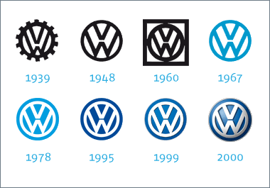 La evolución del diseño del escudo de la casa Volkswagen a lo largo de los años: de líneas puras a una mejor proporción entre las letras V y W y un aspecto 3D realista. |
